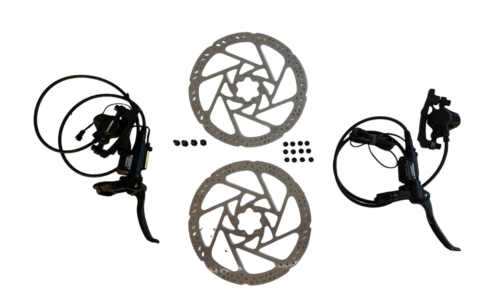 - Hydraulic Disc Brake With Sensor Control Design- Open System, Dual Piston- Sensor Control Designed- Easy Installation, Adjustment And Maintenance.Lever- Forged Aluminum Lever / Cast Aluminum Bracket- Adjustable Angle Reservoir Tank- Two Pieces Bracket- 2.5 Finger Ball End Blade- Colour : Black Caliper- Forged Aluminum Body- Automatic Caliper Positioning Via Front And Rear Adapters- Finish: Black (as pic. shown)Pads- Standard Pads: A10.11 (Metal Ceramic Compound) - Easy ReplacementRotor- Light Wave Type (TR160-7)- High Heat Dispersion & Heat Tolerance- Diameter : Ø160mmHose Length: Front: 900 mm / Rear: 1500 mmWeight: Front wheel approx. 377 grams / Rear wheel approx. 394 grams (Excludes rotor & mounting bolts)Package includes:- Brake caliper x2 (Front and Rear)- Brake lever x2 (Left - front and Right - rear)- Hose x2- Brake pad x2- OEM package (This item is exactly as pictured and does not include retail package)- 160mm Rotor x2